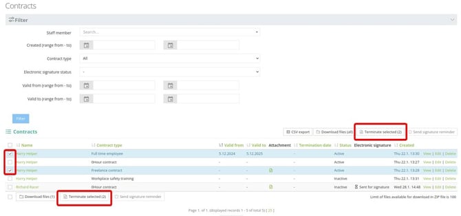 When using our e-signatures feature or when inserting only information about the contract without uploading any file, you can add one contract to more staff members at once from staff list.