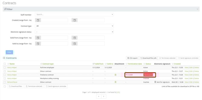 Check and manage the contracts from the contracts page in the menu > Staff.