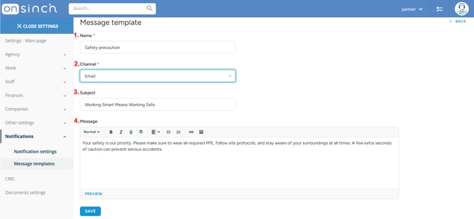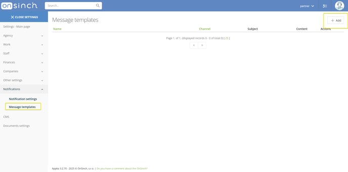 To set a template navigate to Settings > Notifications > Message templates. At the top right corner click on +Add.