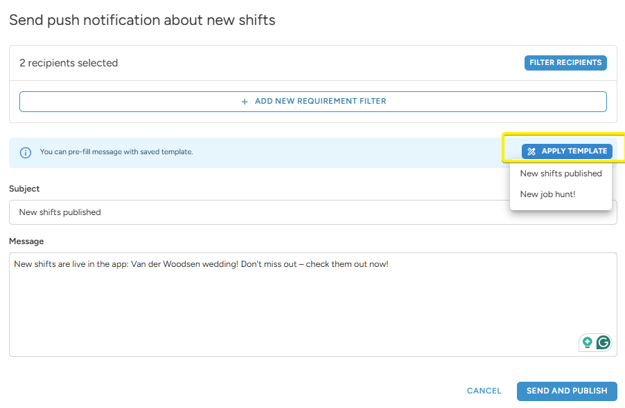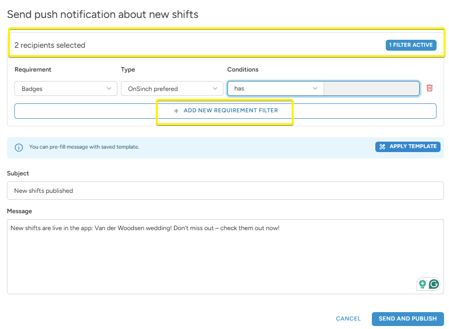 4. In the new window you can select the list of reciepients so you can announce the shift only to specific staff members. You are filtering the staff members by requirements.