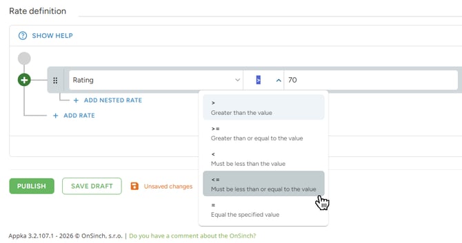 - Rating: Set a rate for a specific rating level (e.g., Rating = 70) or use operators to create groups (e.g., Rating 70 or less).