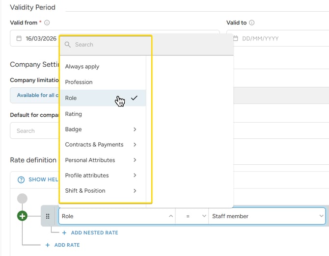 - Attributes: Use any custom field from the staff profile (e.g., certificate or language skills) if it affects their wage.