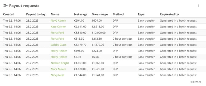 If you allow your staff members a payout request, this widget will show you the pending ones so you don't miss any. It will also show you the ones generated in the batch request section so you know the status of the payout process.
