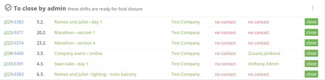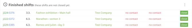 In this category is the list of finished shifts that are waiting to be closed by a lead worker. The lead worker had recorded an attendance and now has to confirm and close the shift.